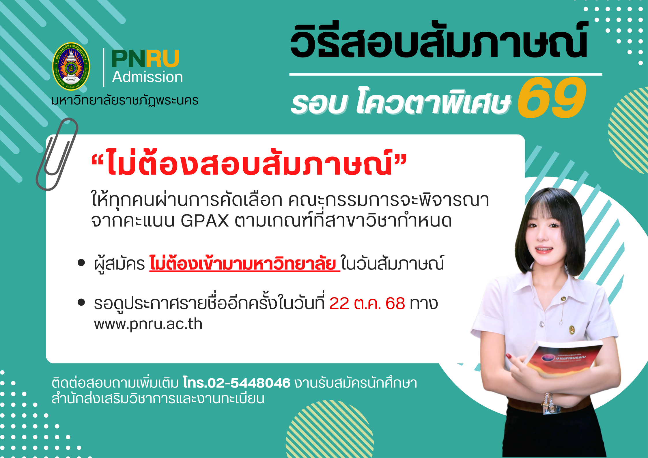 นางสาวดวงพร ทรัพย์ประทุม | วัน: - เวลา: - ห้อง: ไม่ต้องสัมภาษณ์ให้ทุกคนผ่านการคัดเลือก โดยพิจารณาจากคะแนนตามเกณฑ์ที่สาขาวิชากำหนด สถานที่: ดูประกาศรายชื่ออีกครั้งวันที่ 22 ตุลาคม 2568 |