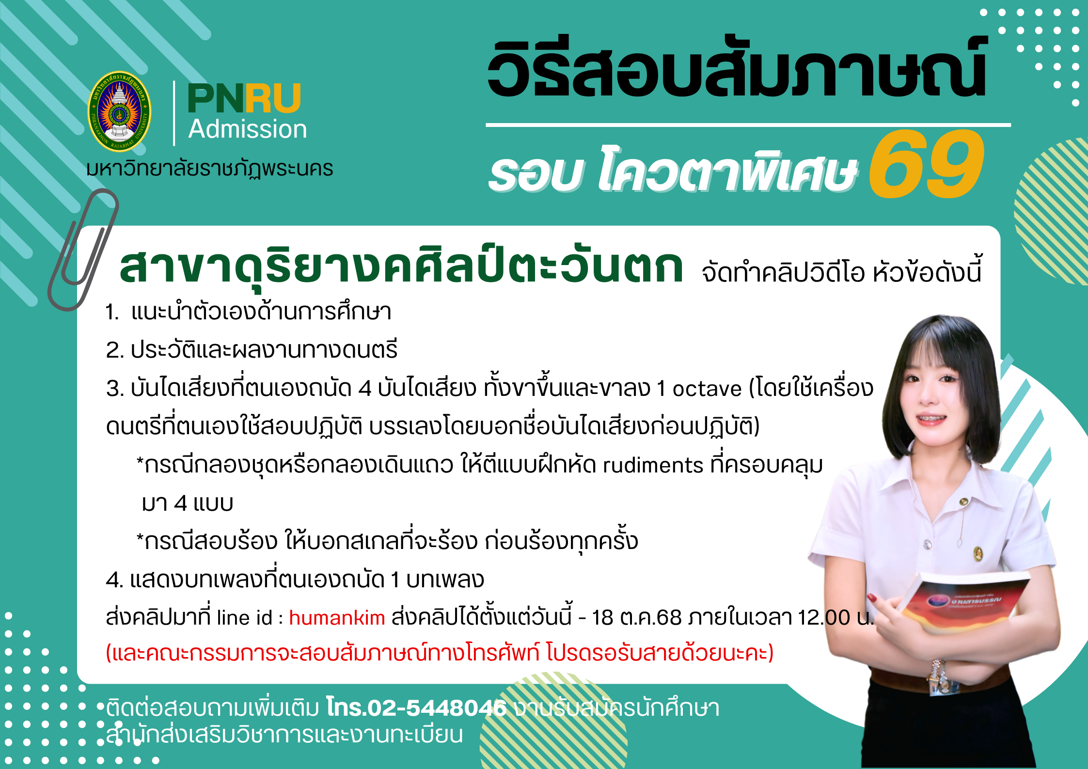นายปฎิพันธ์ สุขสิม | วัน: 19-ต.ค.-68 เวลา: - ห้อง: จัดทำคลิปวิดีโอแนะนำตัวเองและแสดงความสามารถ ส่งภายในวันที่ 18 ต.ค. 68 สถานที่: รายละเอียดดังหมายเหตุด้านล่าง |