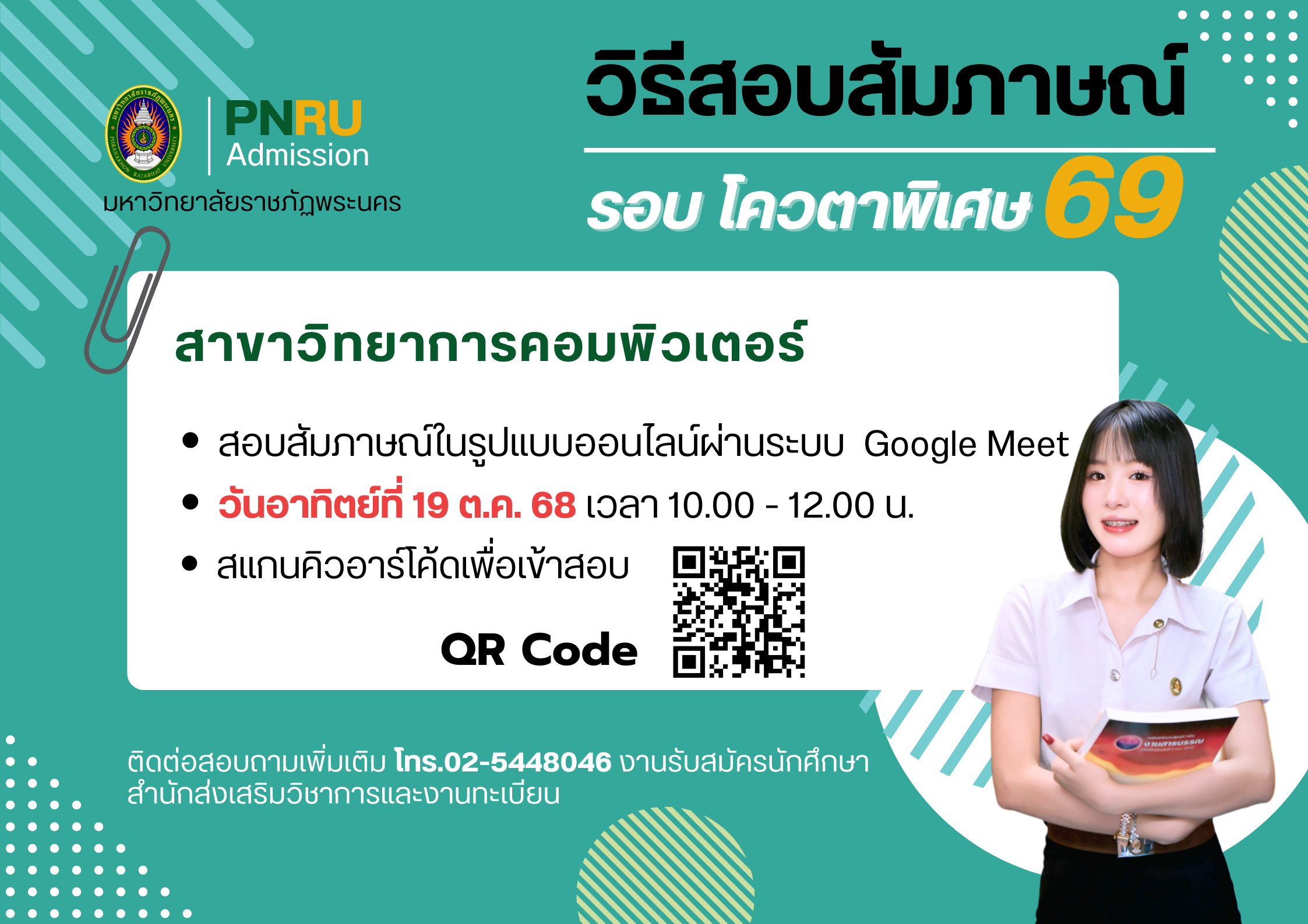 นางสาวอัญชิษฐา จุฬมุสิก | วัน: 19-ต.ค.-68 เวลา: 10.00 -12.00 น. ห้อง: สอบสัมภาษณ์ในรูปแบบออนไลน์ผ่านระบบ google meet โดยสแกนคิวอาร์โคดเพื่อเข้าสอบสัมภาษณ์ สถานที่: รายละเอียดดังหมายเหตุด้านล่าง |