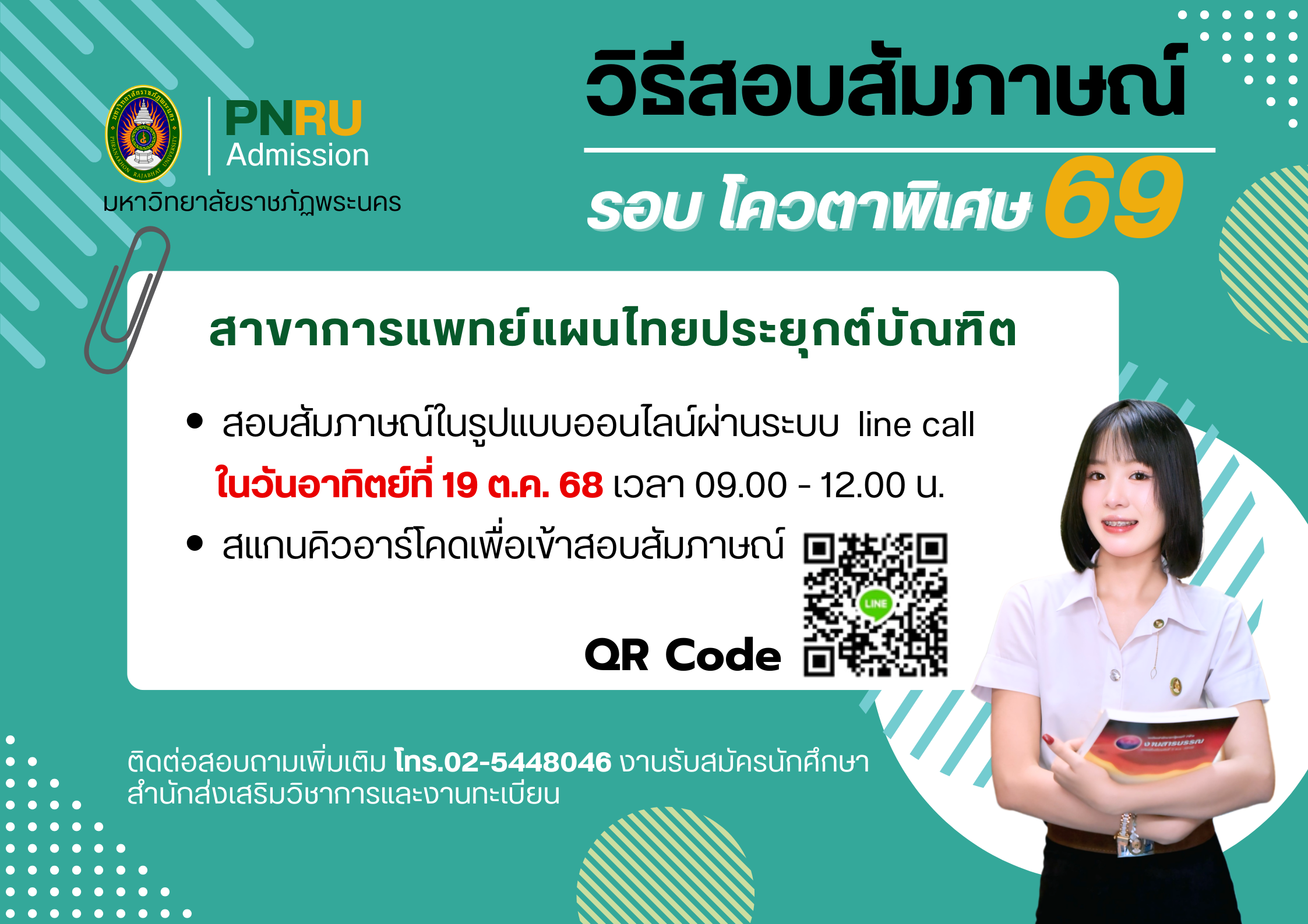 นางสาวแพรวา ศักดา | วัน: 19-ต.ค.-68 เวลา: 09.00 - 12.00 น. ห้อง: สัมภาษณ์ออนไลน์ผ่านระบบ line call สถานที่: รายละเอียดดังหมายเหตุด้านล่าง |