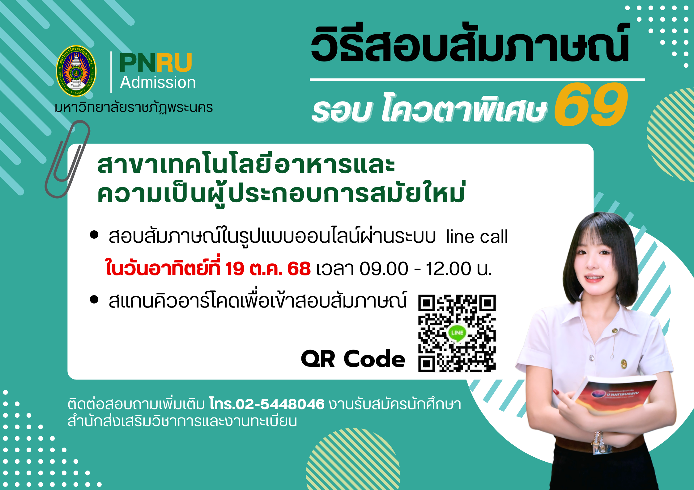 นางสาวขนิษฐา ธรรมวิหาร | วัน: 19-ต.ค.-68 เวลา: 09.00 - 12.00 น. ห้อง: สัมภาษณ์ออนไลน์ผ่านระบบ line call สถานที่: รายละเอียดดังหมายเหตุด้านล่าง |