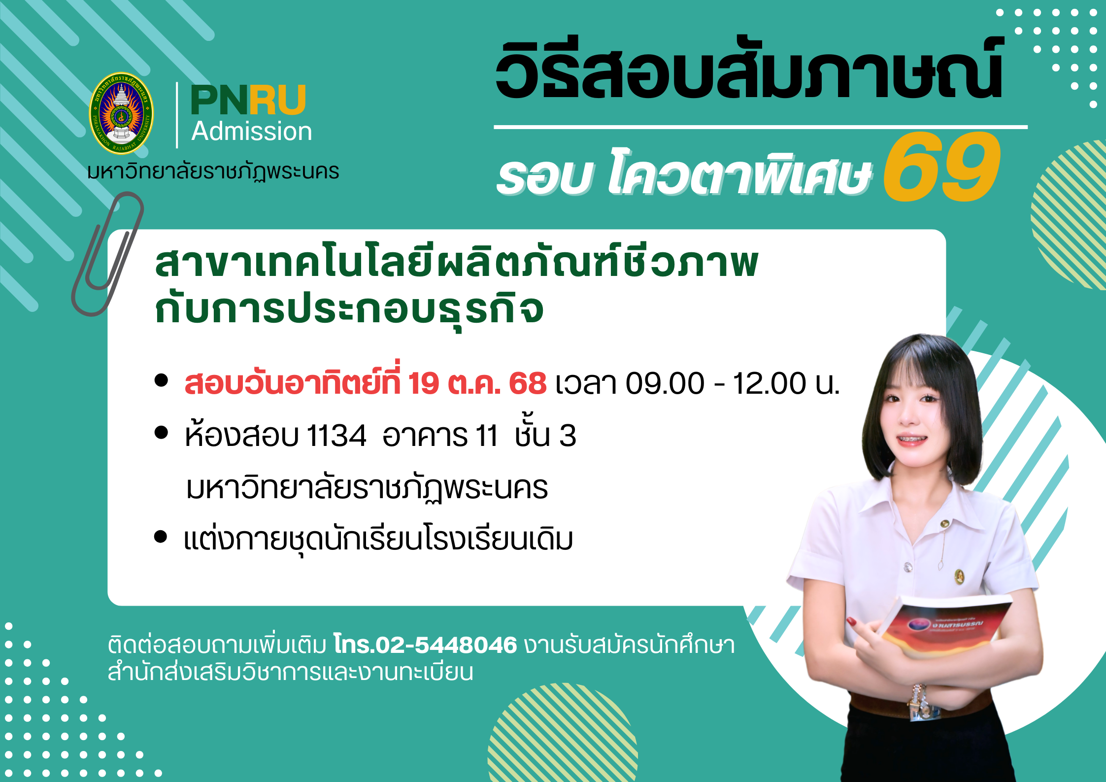 นางสาวชุติภาส เกียรติประทุม | วัน: 19-ต.ค.-68 เวลา: 09.00 - 12.00 น. ห้อง: ห้อง 1134 สถานที่: อาคาร 11 ชั้น 3 มหาวิทยาลัยราชภัฏพระนคร |