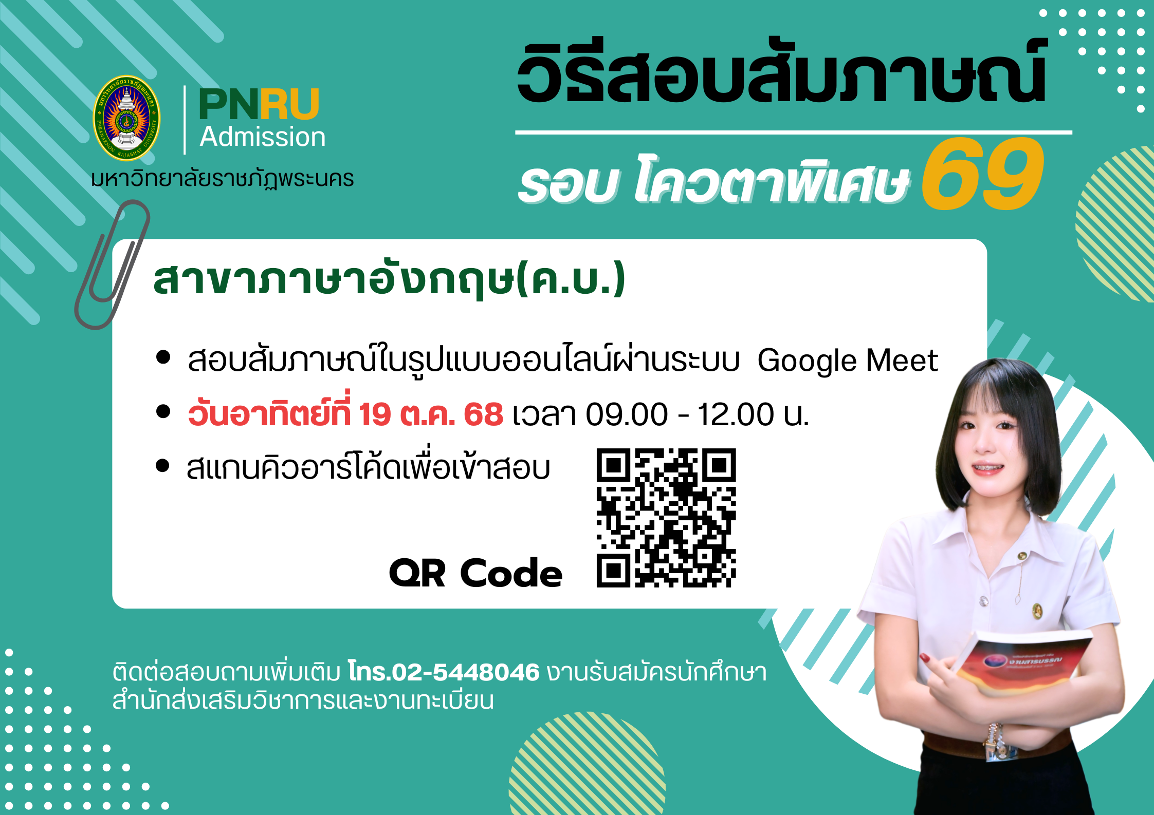 นางสาวไพรินทร์ พงษาเทศ | วัน: 19-ต.ค.-68 เวลา: 09.00 -11.00 น. ห้อง: สอบสัมภาษณ์ในรูปแบบออนไลน์ผ่านระบบ google meet โดยสแกนคิวอาร์โคดเพื่อเข้าสอบสัมภาษณ์ สถานที่: รายละเอียดดังหมายเหตุด้านล่าง |