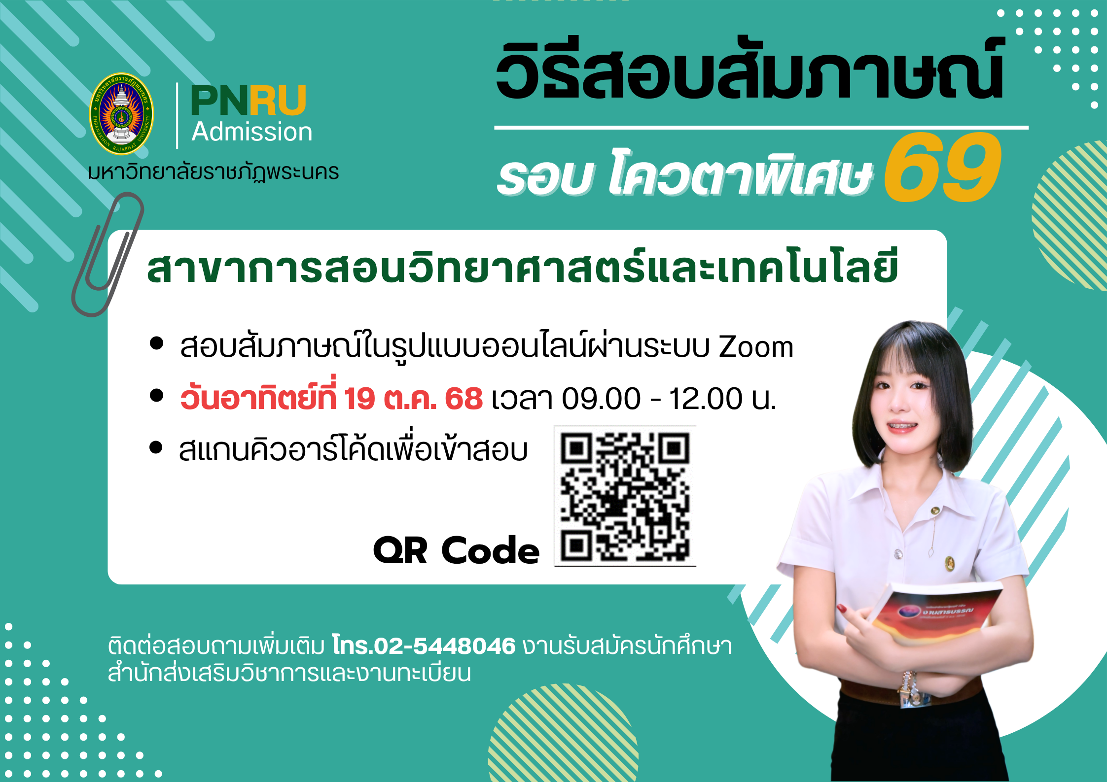นายภพธรรม เผือกทับทอง | วัน: 19-ต.ค.-68 เวลา: 09.00 -11.00 น. ห้อง: สอบสัมภาษณ์ในรูปแบบออนไลน์ผ่านระบบ Zoom โดยสแกนคิวอาร์โคดเพื่อเข้าสอบสัมภาษณ์ สถานที่: รายละเอียดดังหมายเหตุด้านล่าง |