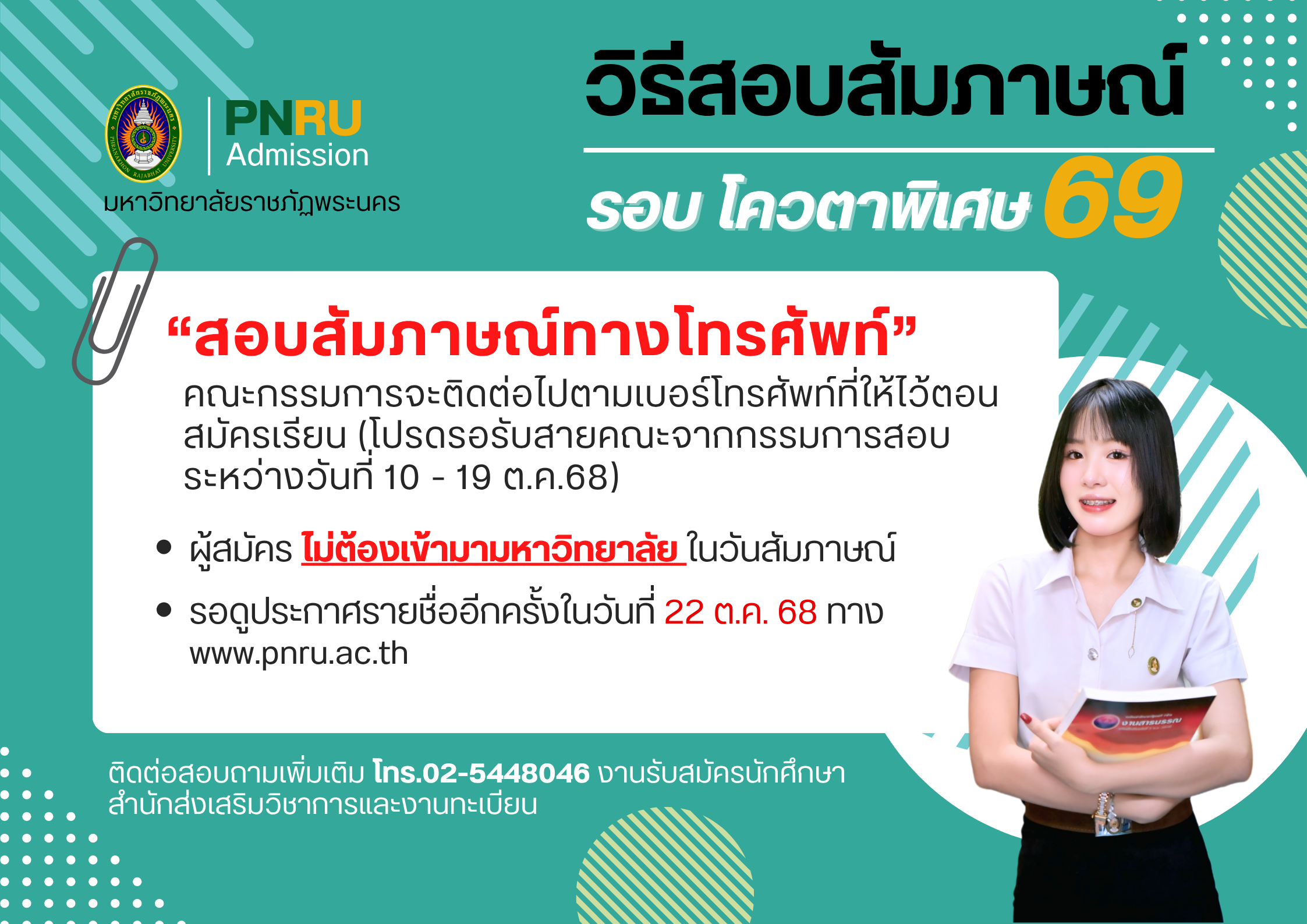 นางสาวธิดารัตน์ เผือกผ่อง | วัน: 19-ต.ค.-68 เวลา: 09.00 น.เป็นต้นไป ห้อง: สัมภาษณ์ทางโทรศัพท์ ตามเบอร์โทรศัพท์ที่ให้ไว้ตอนสมัครเรียน สถานที่: โปรดรอรับสายจากคณะกรรมการ ระหว่างวันที่ 10-19 ต.ค.68 |