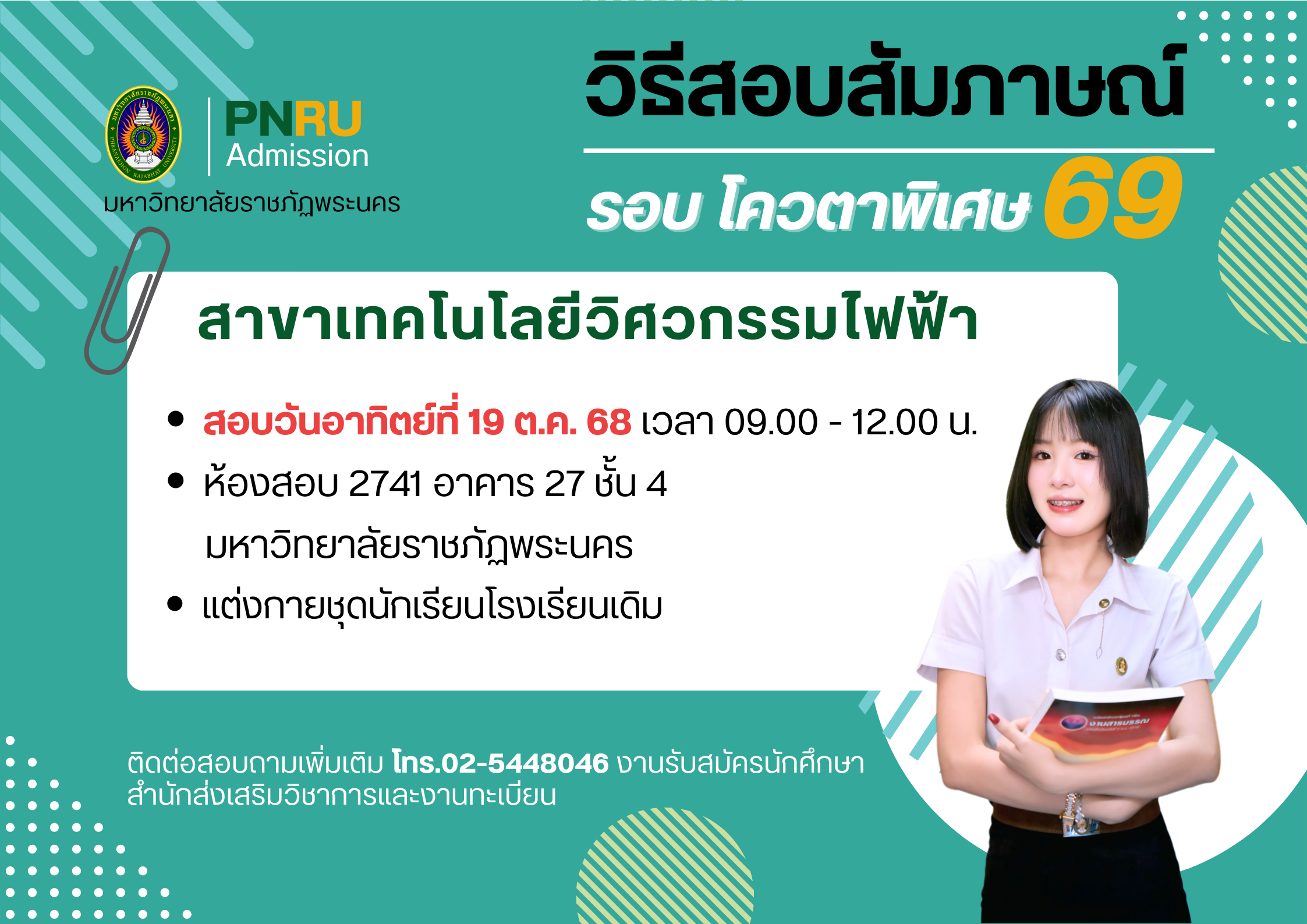 นายปางพิษณุ สุตาโย | วัน: 19-ต.ค.-68 เวลา: 09.00 - 12.00 น. ห้อง: ห้อง 2741 ชั้น 4 สถานที่: อาคาร 27 มหาวิทยาลัยราชภัฏพระนคร |