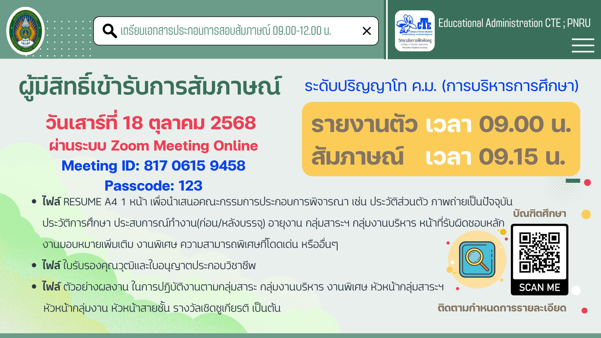 นายกันต์ศักดิ์ วิสัยหมั่น | วัน: เสาร์ที่ 18 ต.ค.2568 เวลา: 9.00 น. ห้อง: ช่องทางการสอบ เข้ากลุ่มโดยแสกนคิวอาร์โค้ด สถานที่: ออนไลน์ ด้วยระบบ ZOOM (โปรดอ่านรายละเอียดตามหมายเหตุด้านล่าง) |